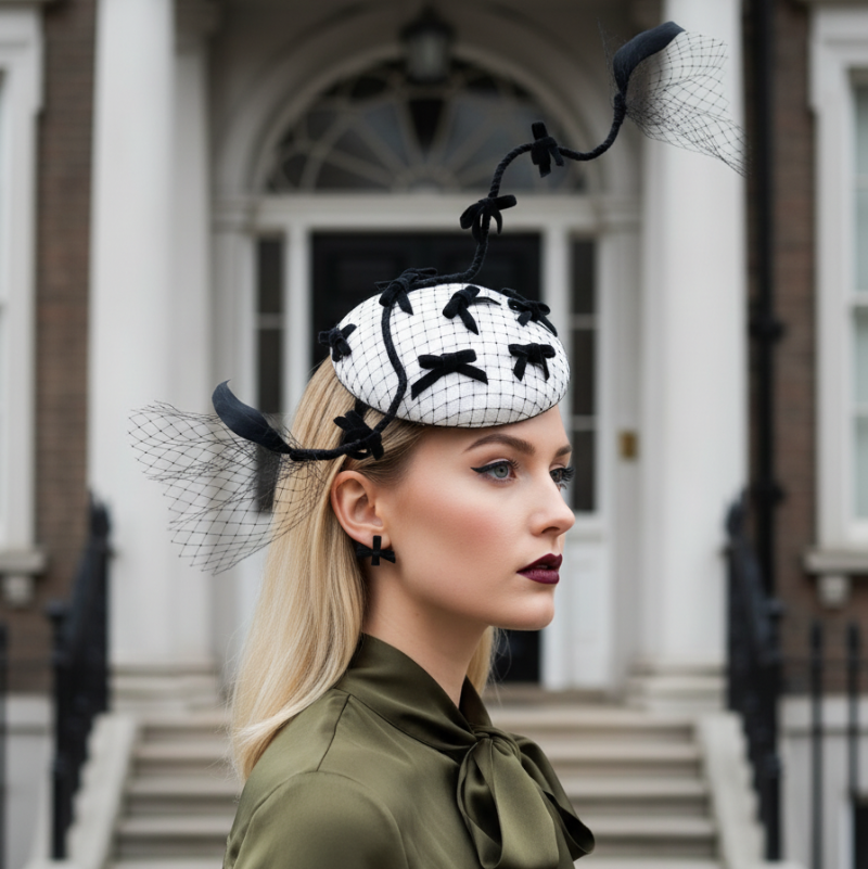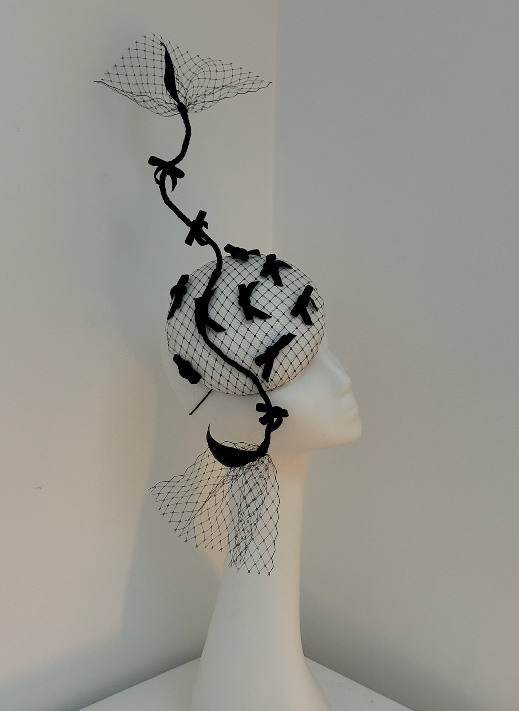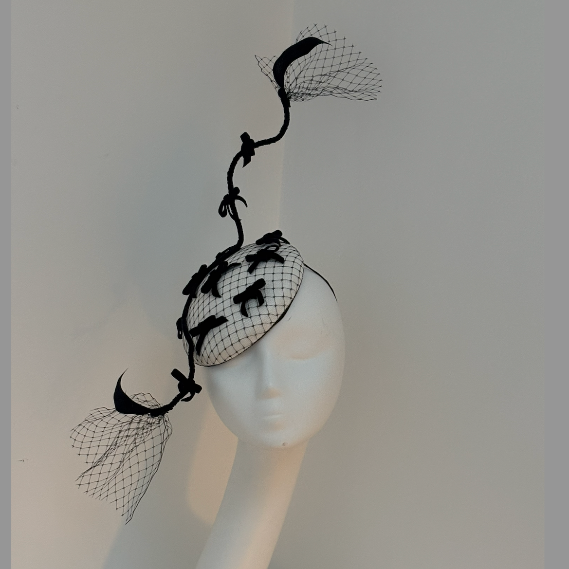 Black and White handcrafted  Hat with velvet bows and sculptural detail