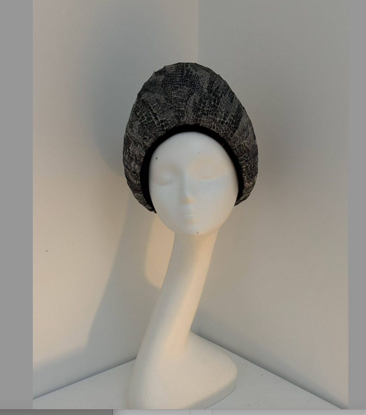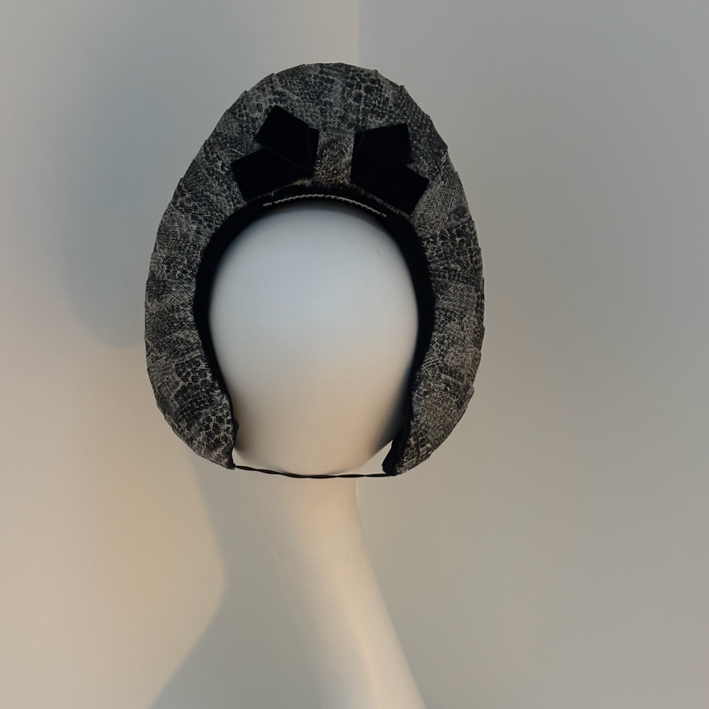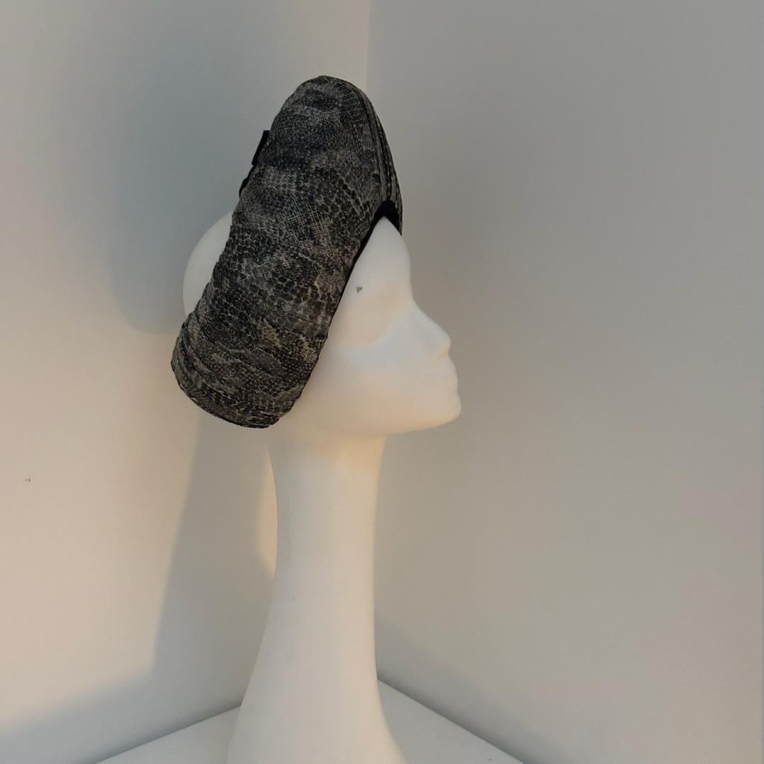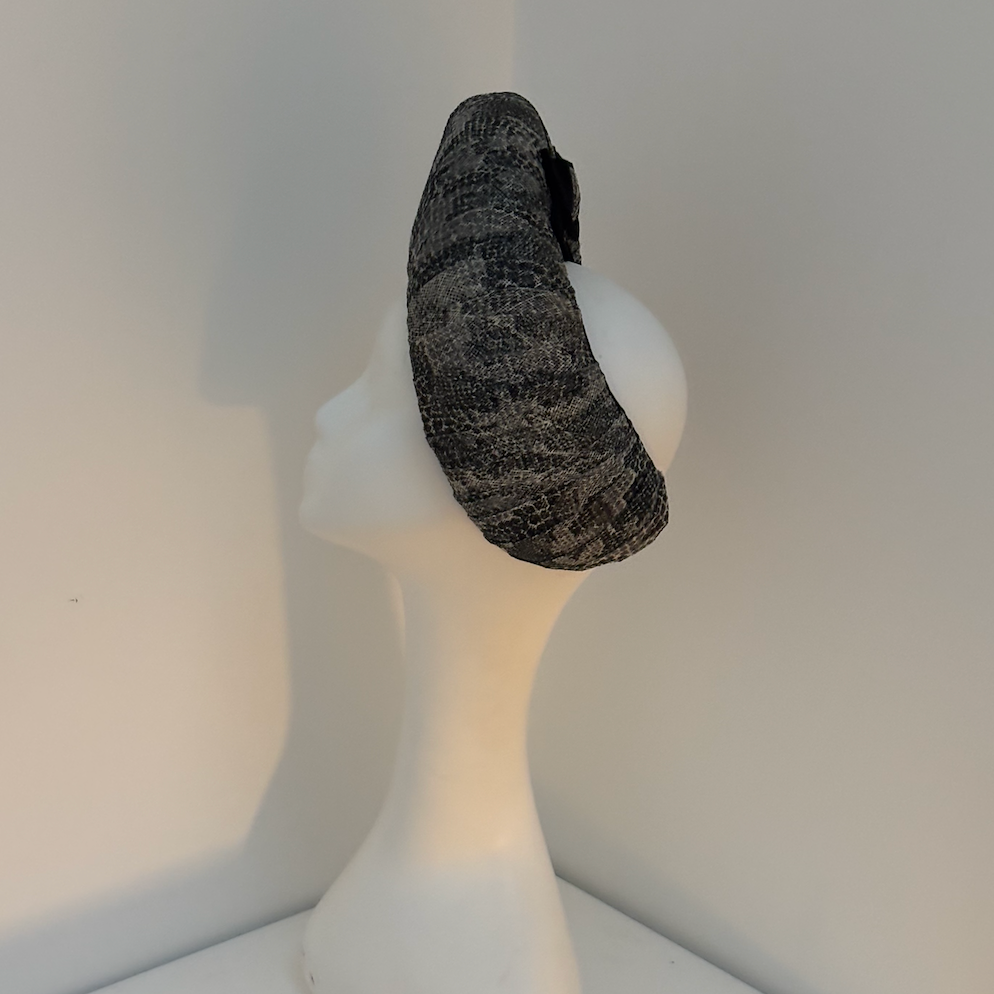 Inspired by iconic 1960s headwear, it is meticulously hand-moulded and covered in four luxurious layers of snakeskin-patterned sinamay for a striking textured finish. A sumptuous velvet bow at the back adds a delightful surprise, ensuring this piece looks stunning from every angle.